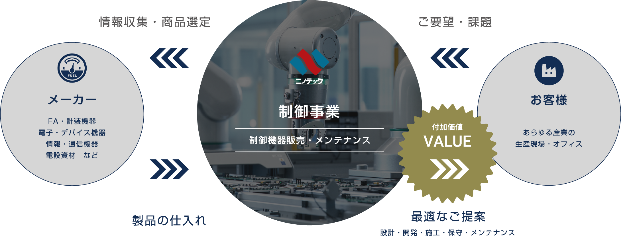 ニノテックは、制御機器の専門商社でありながら、技術支援にも力を入れる現場のパートナーです。