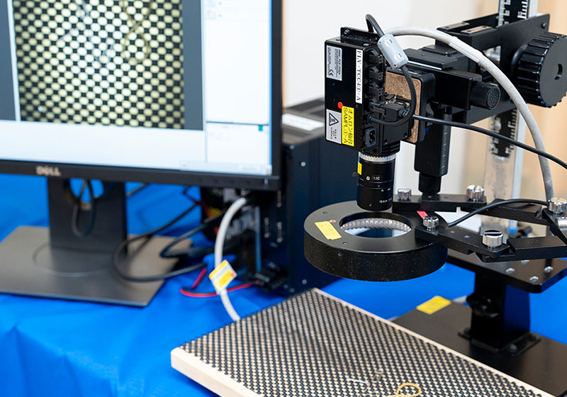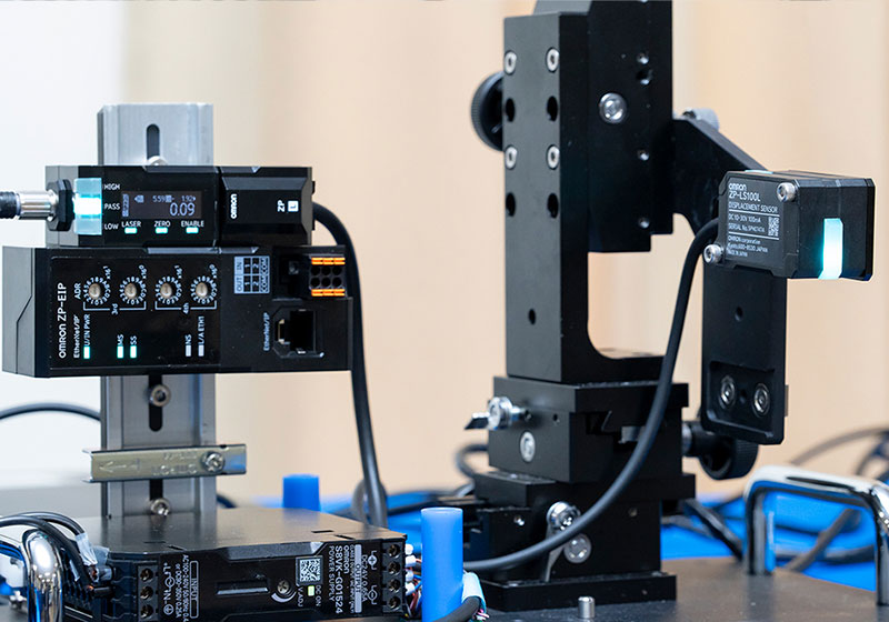 製品の寸法を画像装置やセンサを用いて人に代わって計測します。長さや厚みなどが規定の寸法の範囲内かを画像装置やセンサを用いて自動計測します。